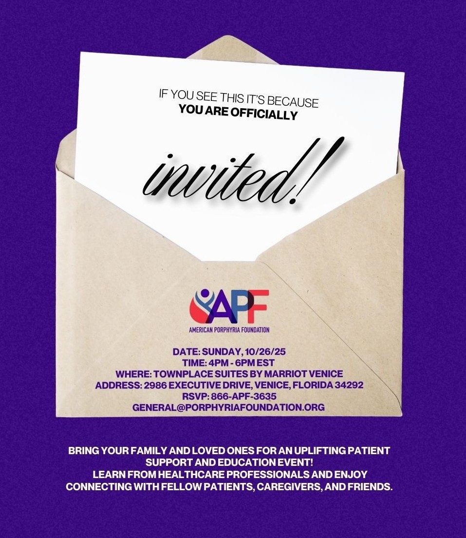 You are our Honored Guests. The APF will host a meeting in Venice, Fl for patients, family, caretakers, friends and anyone interested in PORPHYRIA. All porphyrias will be represented . Enjoy the fun of meeting other porphyria people, as well as learn from healthcare professionals and other patients who will share their journey. Everyone is invited. Contact the APF at 866 APF 3635 or general@porphyriafoundation.org for details or to RSVP.